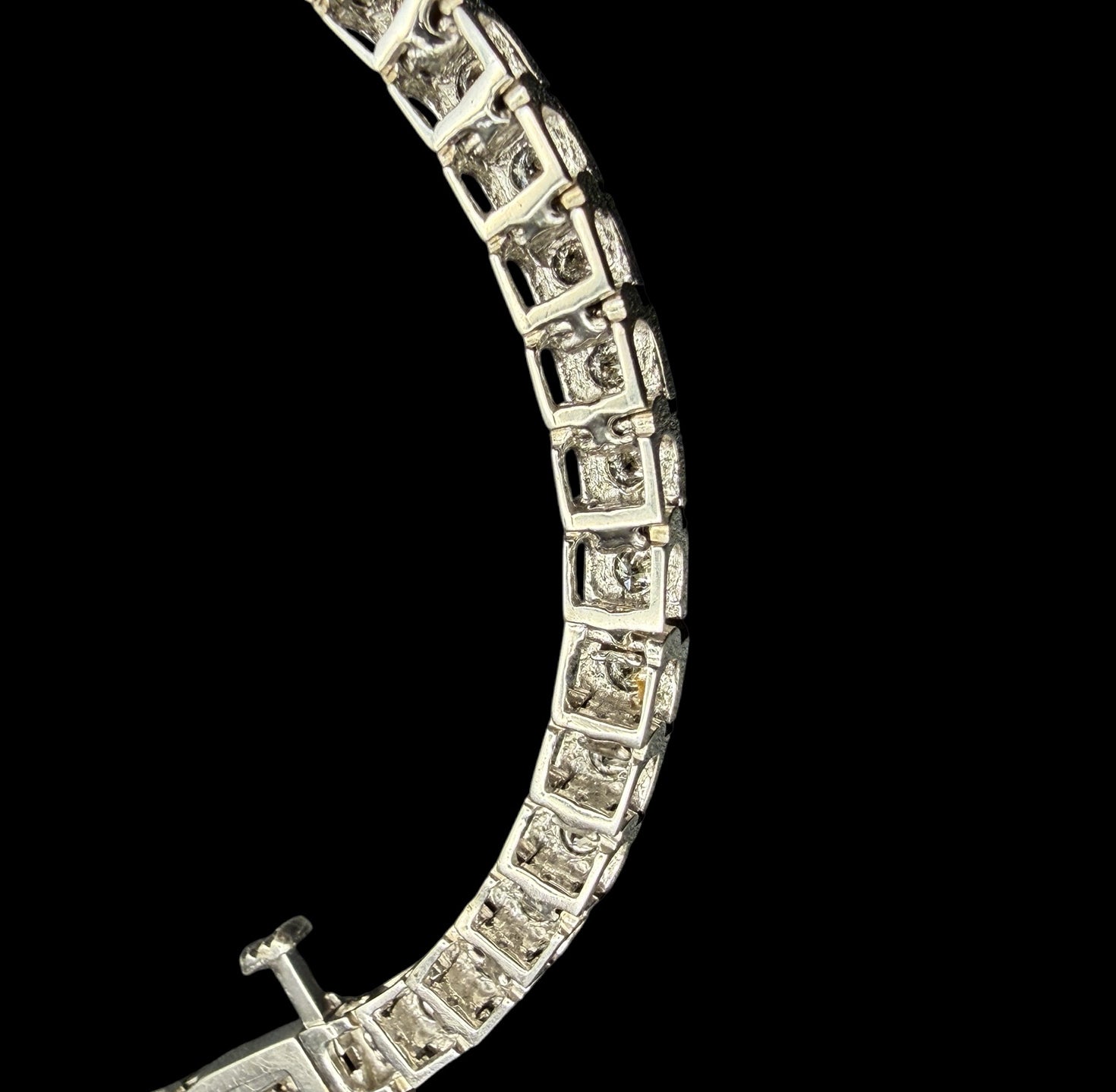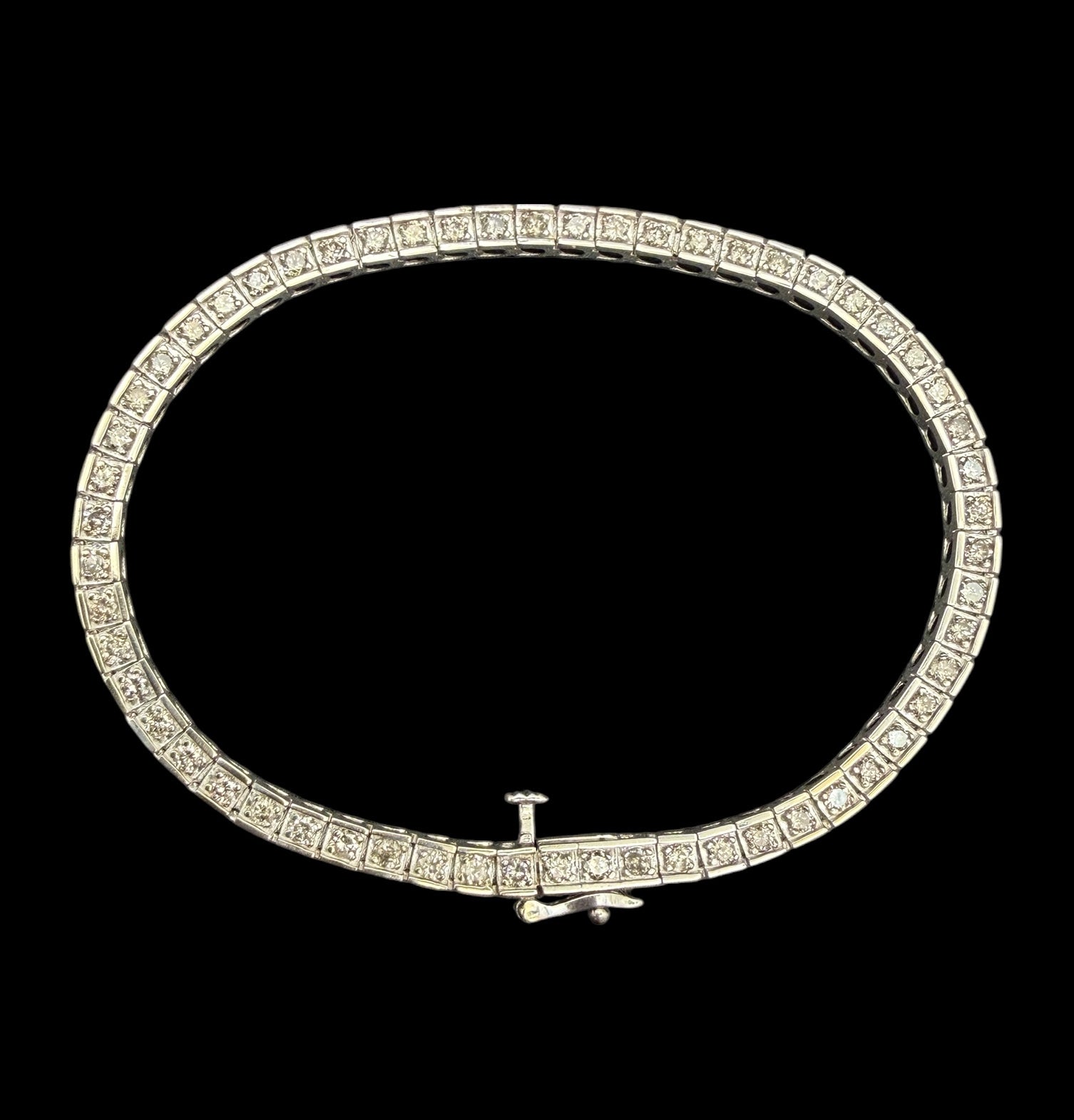A petite little sparkler of a tennis bracelet in rhodium-plated white gold. 58 natural brilliant-cut diamonds, all on the warm side landing at M to S, I1 and totaling 1.74ctw. They're set in boxy links for some extra presence, closing with a secure latched clasp.